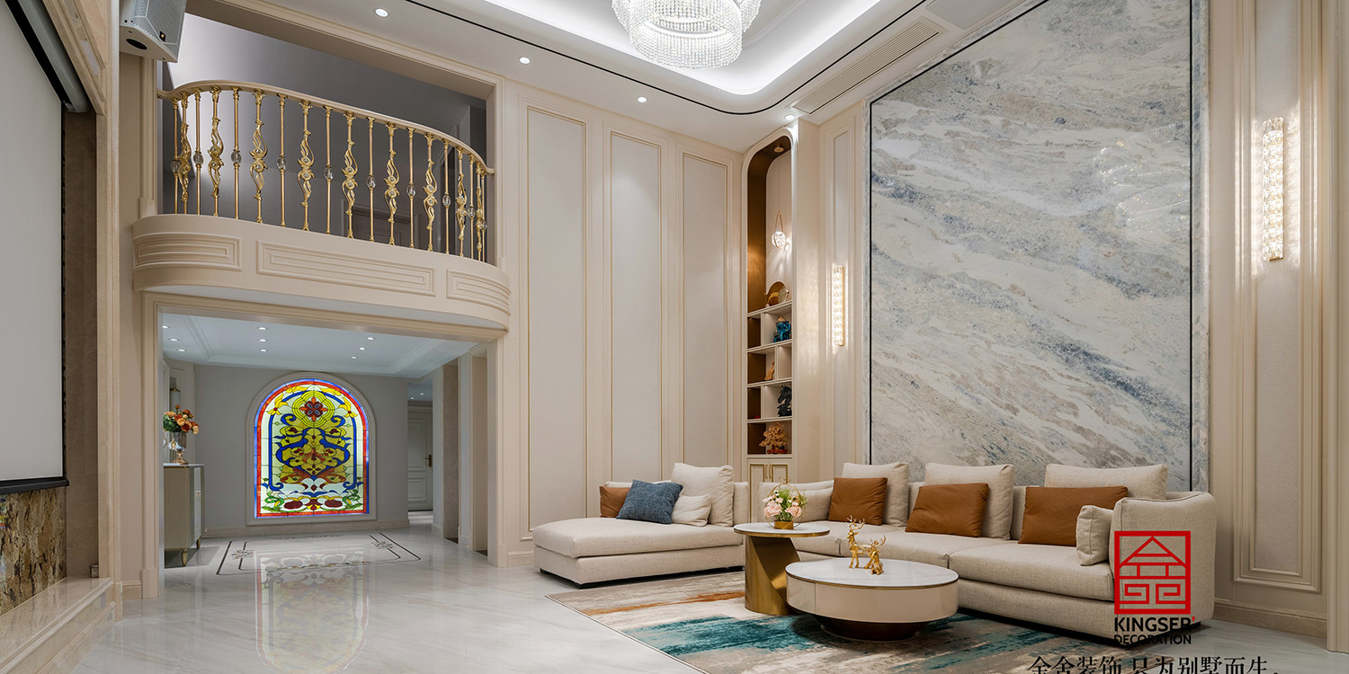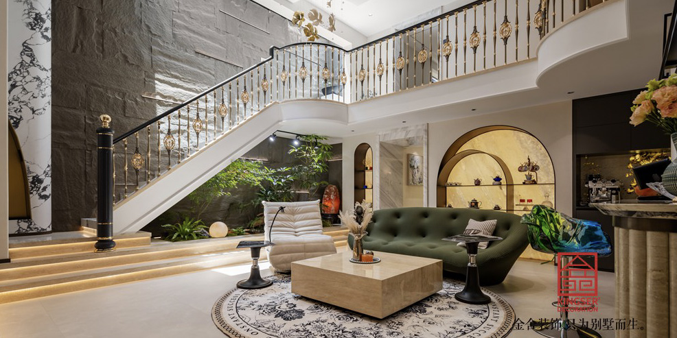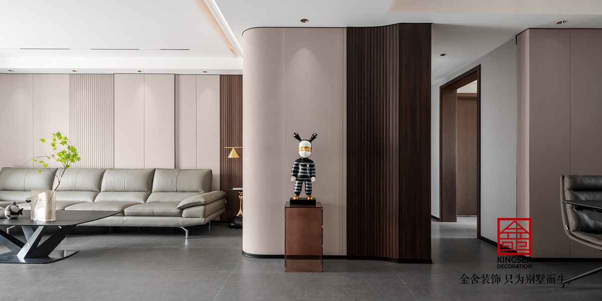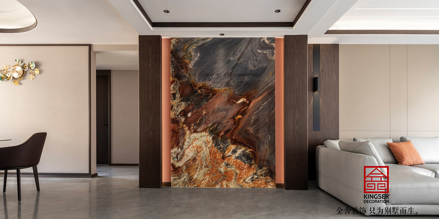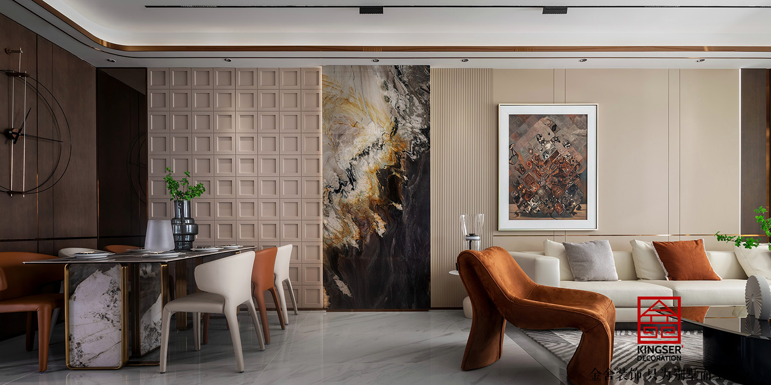 褪去城市繁冗華麗的外殼,回歸至與人的內在共鳴,斑駁的光影在客廳空間徜徉,大理石與墻板的搭配,釋放出一種優雅、沉靜及治愈的氛圍感,貫穿于整個別墅裝修空間的動線。